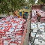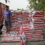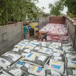 Daí pra frente um caminhão menor transporta os produtos pouco a pouco. O volume fica armazenado em um local específico, até que tudo seja levado até a fazenda. Quem dirige o caminhão menor é o Sr. Oseias.
